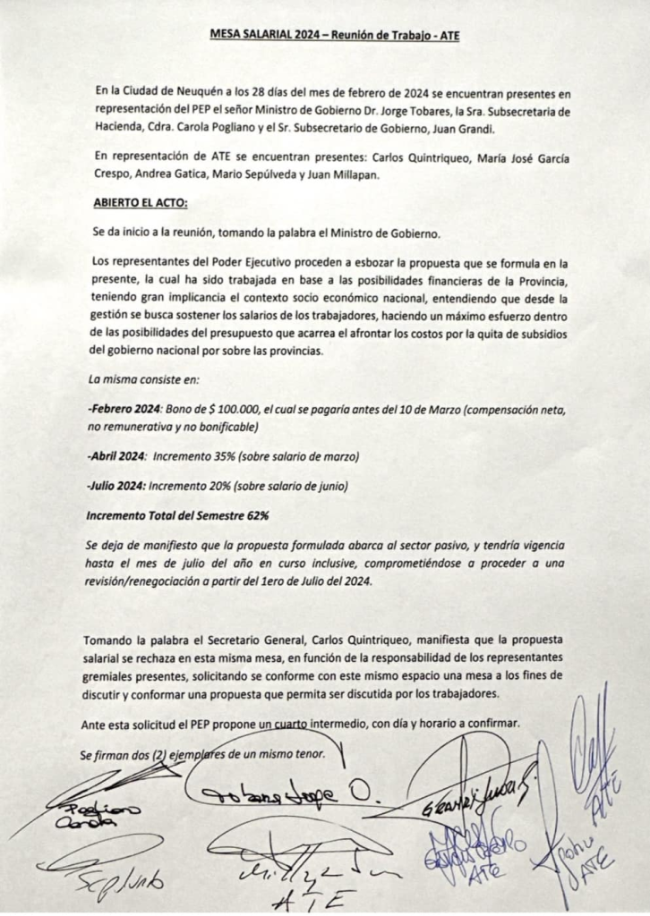 El secretario general de ATE, Carlos Quintriqueo, dijo que solicitaron que “constituyan un espacio donde poder tener una discusión real” sobre el aumento de los salarios de los trabajadores que representan. “No vamos a llevar algo que sabemos va a ser rechazado por el conjunto de los estatales. Por eso tomamos la decisión de no aceptarla”, aseguró.