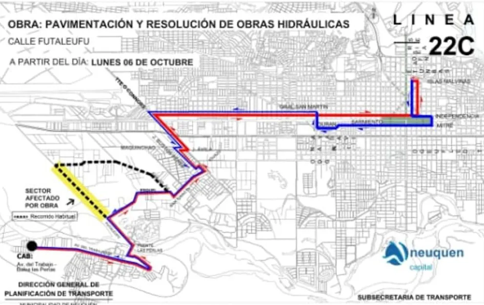 La Municipalidad de Neuquén informó que, por la ejecución de obras de pavimentación y mejoras hidráulicas en calle Futaleufú, entre Esquel y Viedma, la línea de colectivo 22C realizará su recorrido solo dentro de la ciudad de Neuquén, tanto en ida como en regreso.