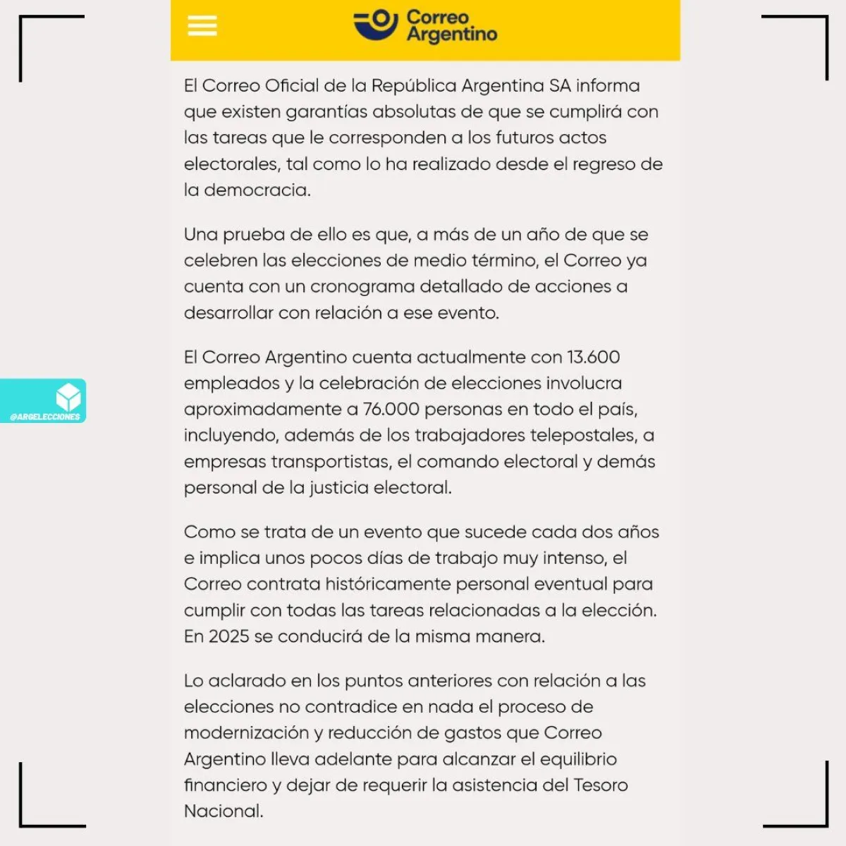 Luego que la Cámara Nacional Electoral expresase su preocupación por el efecto que la reducción de personal en el Correo tendría en las elecciones, la empresa emitió un comunicado donde “garantiza” que cumplirá con “plena normalidad su rol” en el 2025.