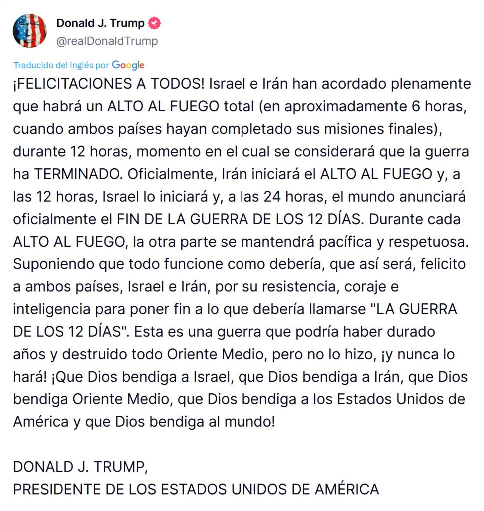 “Israel e Irán han acordado completamente un CESE TOTAL Y COMPLETO DEL FUEGO (dentro de unas seis horas, una vez que ambas partes hayan concluido sus misiones finales en curso), por 12 horas, al término de las cuales la guerra será considerada FINALIZADA”, escribió el mandatario en sus redes sociales.
