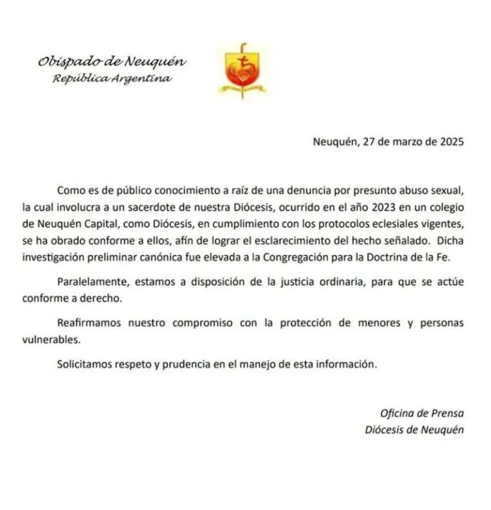 El Obispado de Neuquén anunció el inicio de una investigación canónica tras la denuncia de un presunto abuso sexual cometido por un sacerdote de la diócesis.