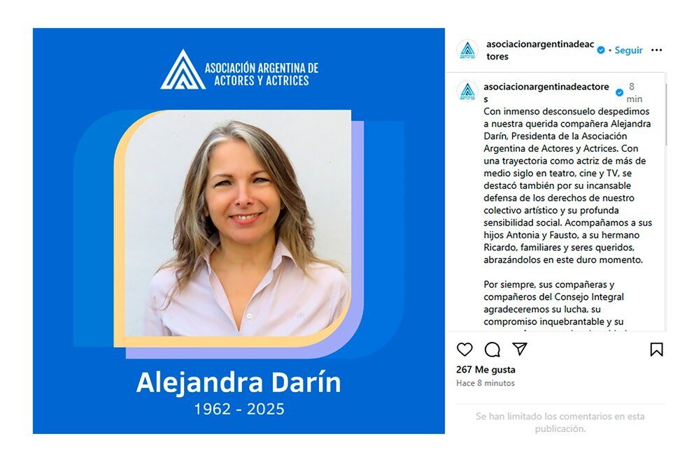 El mundo del espectáculo se conmocionó las últimas horas al conocerse la muerte de Alejandra Darín. La noticia fue dada conocer por la Asociación Argentina de Actores y Actrices, donde se desempeñaba como presidenta.
