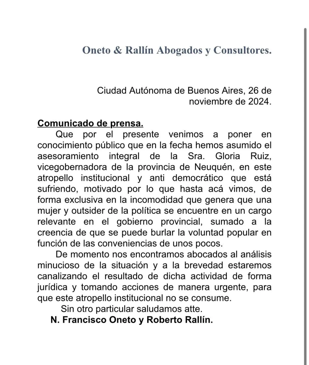 En medio de las crecientes tensiones políticas en Neuquén, los abogados de la vicegobernadora Gloria Ruiz, N. Francisco Oneto y Roberto Rallín, emitieron un contundente comunicado denunciando lo que describen como un “atropello institucional y antidemocrático” en su contra.