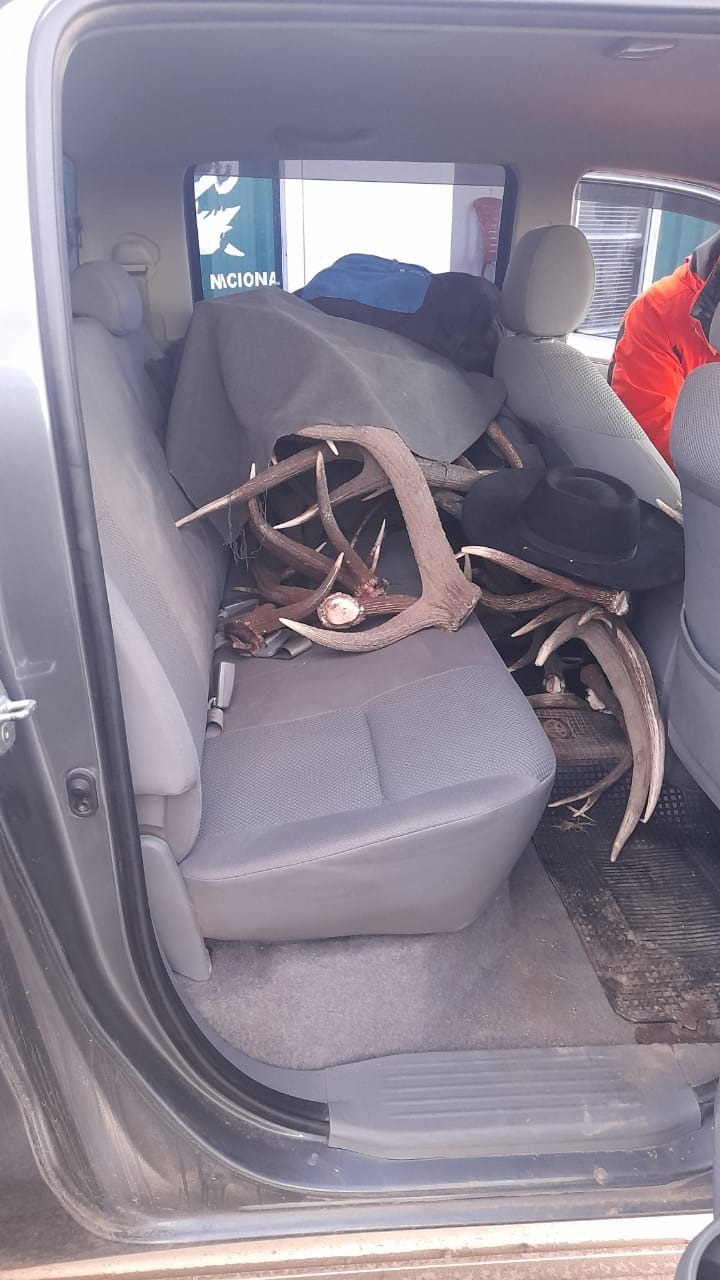 En la caja tapada con una lona se podía observar gran cantidad de astas de ciervo colorado, como también otras en el asiento.