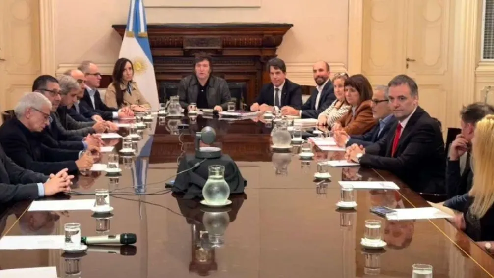 Participan además del encuentro en el Salón de Eva Perón los ministros Patricia Bullrich (Seguridad), Mario Lugones (Salud), Mariano Cúneo Libarona (Justicia), Luis Petri (Defensa) y Luis “Toto” Caputo (Economía).