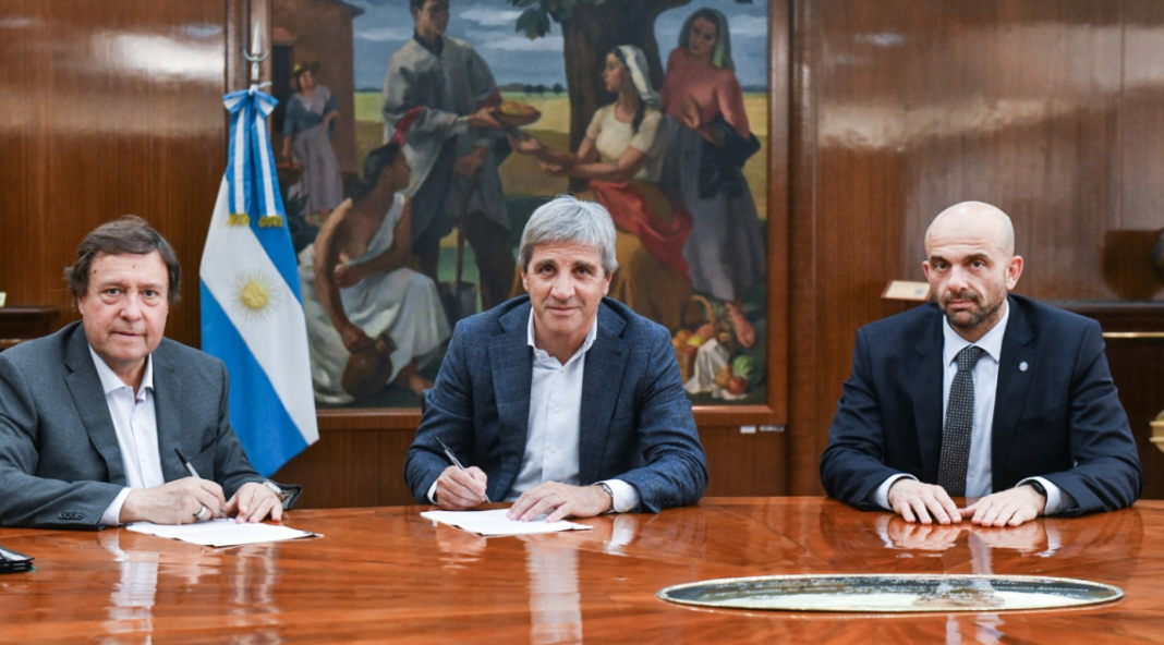 El ministro de Economía, Luis Caputo, junto al Gobernador de Río Negro, Alberto Weretilneck y el secretario de Transporte, Franco Mogetta, firmaron este miércoles en el Palacio de Hacienda la extensión por 180 días de la concesión de los servicios ferroviarios de carga y pasajeros en los 1.040 kilómetros de vías en los que presta servicios la provincia.